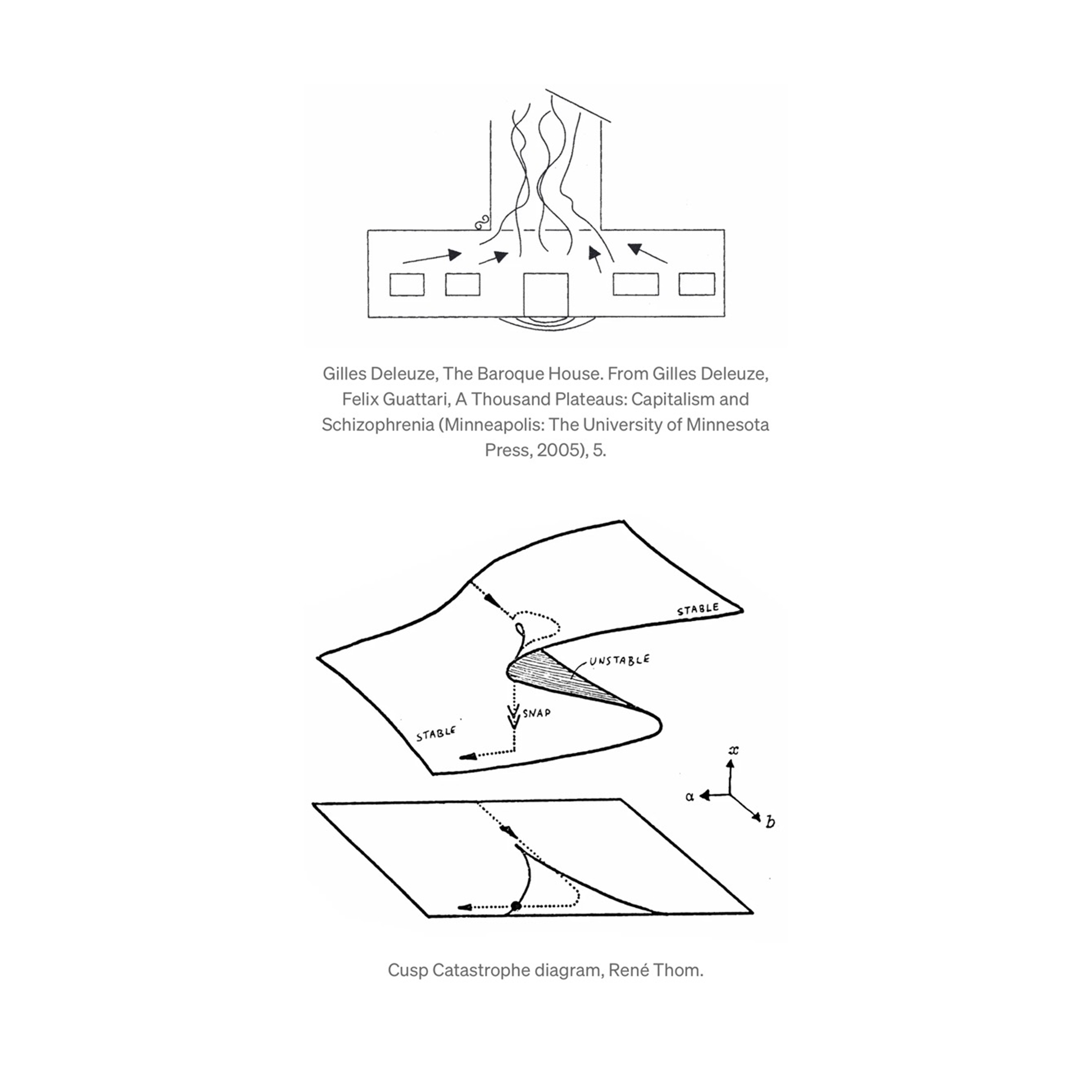 In architecture, 'folding' applies thinking to physical space, creating new pathways and experiences. It fosters organic connections between spaces, aiming for experiential transformation rather than just formal change. This concept reflects Deleuze’s idea of the 'fold', which breaks fixed boundaries, and aligns with form-generating language that embraces dynamic processes. Folding creates multi-dimensional connections, transforming both spatial form and experience organically.